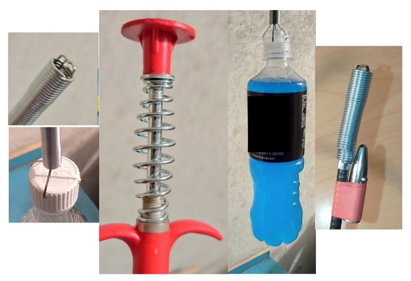 Przeróbka polegała na obcięciu o 9mm dolnej sprężyny osłaniającej pazurki, przez co otwierają się one na tyle, by złapać zakrętkę 35mm średnicy. Poprawiłem też osadzenia górnej sprężyny napinąjącej pod przyciskiem. Spowodowało to, że obecnie siła zaciskowa chwytaka wzrosła do tego stopnia, że bez problemu utrzymuje w powietrzu butelkę 0,75l z płynem. By w czeluści słupków gdzie żmijka będzie pracować było cokolwiek widać, nad sprężyną osłaniającą pazurki zamocowałem mini latarkę LED. Zmiany i efekty ich wprowadzenia widać na zamieszczonych zdjęciach.