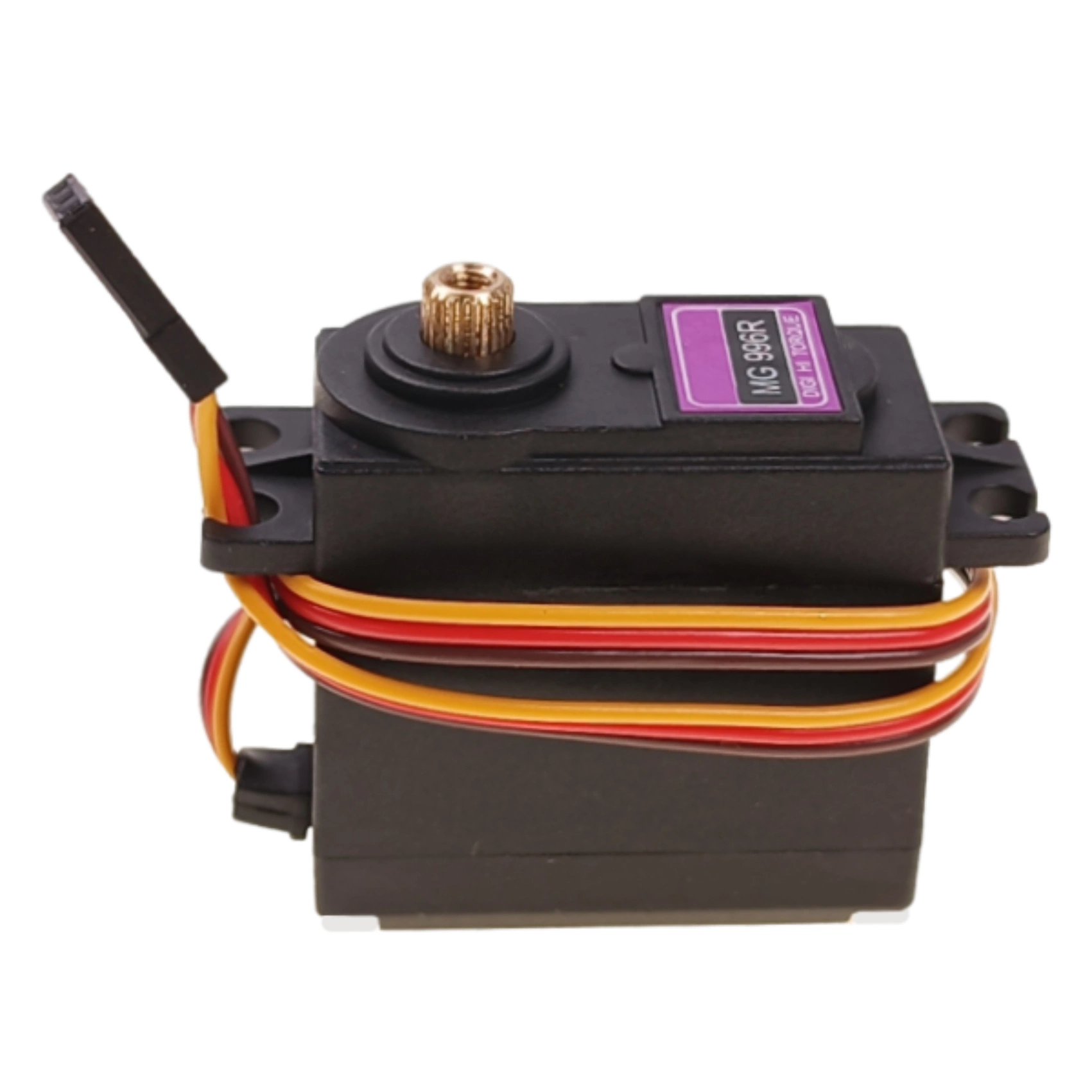Serwo cyfrowe MG996R 90º. Jest to w istocie ulepszona wersja słynnego serwomechanizmu TowerPro MG995. Przeprojektowany układ PCB i IC Controll co sprawia, że jest o wiele bardziej dokładne. Wewnętrzna przekładnia i silnik są również zmodernizowane w celu poprawy martwego pasma i centrowania.