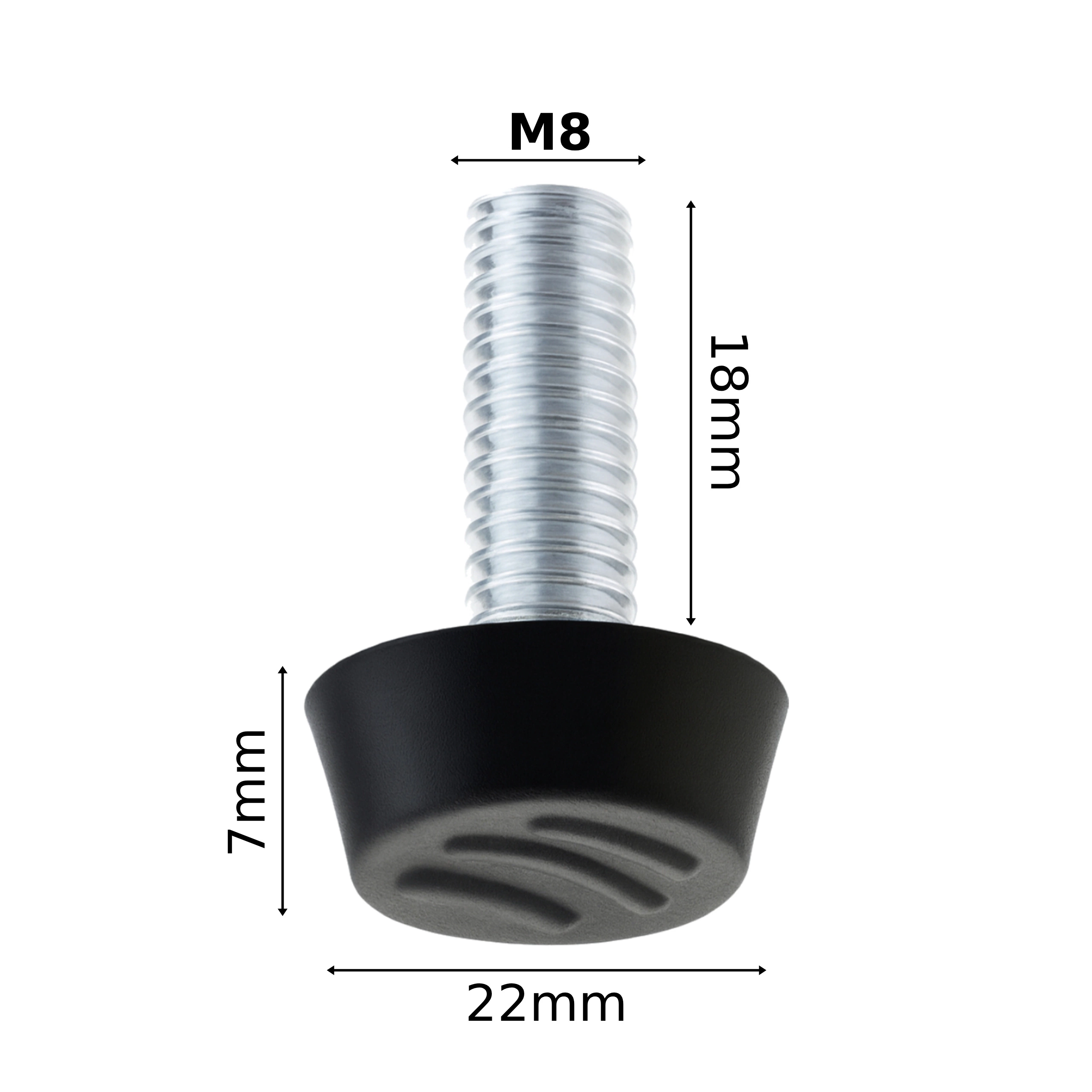 Stopka regulowana do mebli, o wymiarach M8 22x18 mm i kolorze czarnym, to praktyczny element wykończeniowy, który zapewnia stabilność i poziomowanie każdego rodzaju mebli.